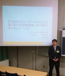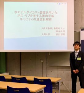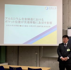 2019年5月20日 / 最終更新日時 : 2019年5月20日 前田安郭 活動 2019年5月18日(土)~19(日) 日本鋳造工学会・第173回全国講演大会@千葉工業大学 2019年5月18日(土)~19(日) (公社)日本鋳造工学会・第173回全国講演大会(千葉工業大学)にて、下記の研究発表を行いました。 M2谷口真伍さん 「アルミニウム合金鋳造におけるポケット位置が充填挙動に及ぼす影響」 M1尾崎太一さん 「水モデルダイカスト装置を用いたボス・リブを有する薄肉平板キャビティの湯流れ解析」 M1杉原拓実さん 「ダイカストスリーブへのラドル注湯における流動現象とMPS粒子法シミュレーション」