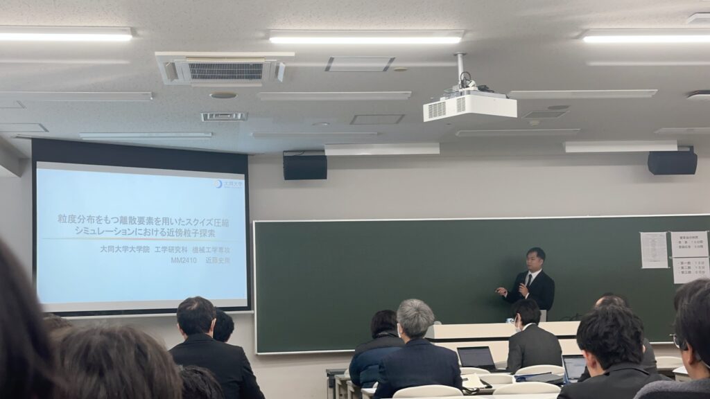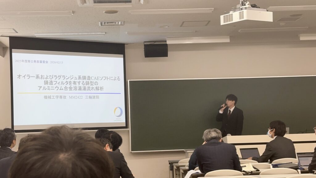 2026年2月18日 / 最終更新日時 : 2026年2月18日 裕希哉田中 活動 2025年度修士論文審査会 2026年2月12日(木)13日(金) 2026年2月12日(木)13日(金)に大同大学大学院 工学研究科 機械工学専攻の修士論文審査会が行われました. 本研究室からはM2の加藤大翔,近藤史崇,三輪建翔が発表を行いました. 加藤大翔 近藤史崇 三輪建翔